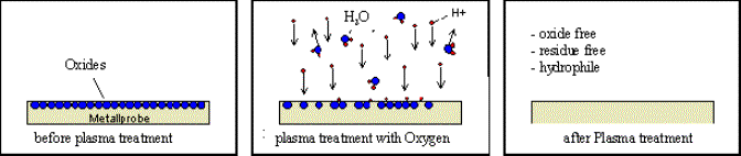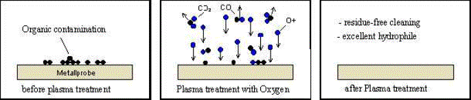 這種處理要采用氫氣或者氫氣與氬氣的混合物。有時也采用兩步處理工藝。第一步先用氧氣氧化表麵5分鍾,第二步用氫氣和氬氣的混合物去除氧化層。也可以同時用幾種氣體進行處理。