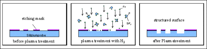 在黄瓜视屏无限播放污日本破解版刻蝕過程中,通過處理氣體的作用,被刻蝕物會變成氣相(例如在使用氟氣對矽刻蝕時,下圖)。處理氣體和基體物質被真空泵抽出,表麵連續被新鮮的處理氣體覆蓋。不希望被刻蝕部分要使用材料覆蓋起來(例如半導體行業用鉻做覆蓋材料)。